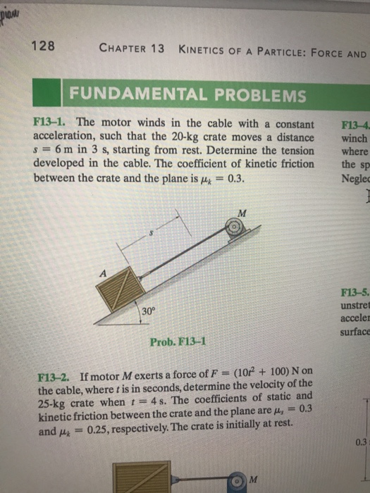 The coefficients of static and kinetic friction between the crate and the plane are us 03 and Hk 025 respectively. The coefficients of static and kinetic friction between the crate and the plane are mu_s 03 and mu_k 025 respectively. If motor M exerts a force of F 10t2100N on the cable where t is in seconds determine the velocity of the 25kg crate when t4s.